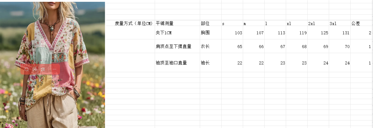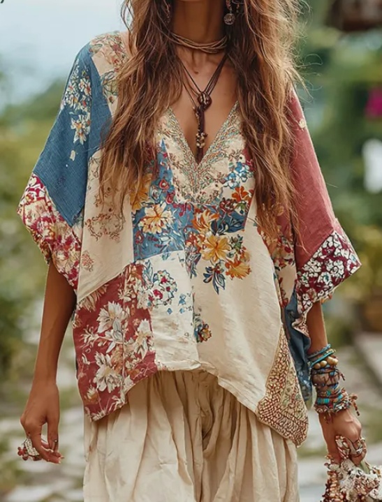 Style: Bohemian retro, casual and relaxed Neckline: V-neck Sleeve type: Three-quarter sleeve Fit: Loose color-blocked top Design: V-neck, loose fit Suitable occasions: Bohemian retro style, everyday casual wear, light vacation occasions, etc. Styling: Can be paired with ripped jeans, woven accessories, and flat sandals.